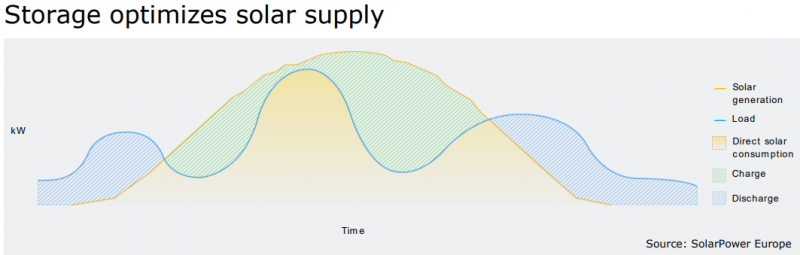 首先,我們從光伏發(fā)電特點和電網(wǎng)用電特點來看。圖一黃色的光伏發(fā)電曲線的計算模型中,僅有部分與用電曲線重合。裝配儲能系統(tǒng)后,當光伏發(fā)電量大于用電量,儲能處于充電狀態(tài);當用電量大于光伏發(fā)電量,儲能處于放電狀態(tài)。儲能系統(tǒng)充當了一個很好的“能源調(diào)節(jié)器”,從而解決了“棄光”這個問題