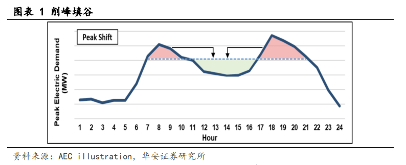 新能源發(fā)電波動性明顯,存在峰值時發(fā)電功率高于電網(wǎng)負荷,產(chǎn)生棄風棄光的問題。未來隨新能源裝機比例提升,棄風棄光的問題將日益突出。加強電網(wǎng)基建可以提升其負荷,使其可以承載更高功率的發(fā)電。配備發(fā)電側儲能則可以在電網(wǎng)輸送通道受限和光伏/風電滿負荷工作的情況下實現(xiàn)調峰,平滑新能源發(fā)電輸出曲線,緩解電網(wǎng)負擔。削峰填谷可以在低需求時段吸收電力,并在高峰需求時段將其釋放到電網(wǎng)或支持客戶的負載。這有效地將一些負荷從高峰時段(紅色)轉移到非高峰時段(綠色)。