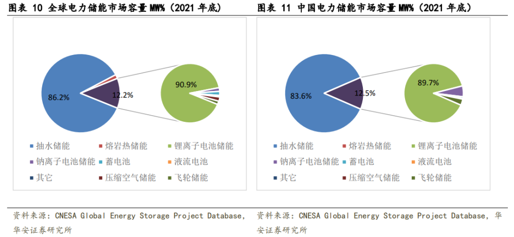 化學儲能和電化學儲能統(tǒng)稱為新型儲能,是目前主要主要的發(fā)展方向。電化學儲能同時具有較高的能量密度和功率密度,決定了其廣泛的技術適用性。其中,鋰離子電池同時具有高功率密度與高能量密度。根據(jù)CNESA全球儲能項目數(shù)據(jù)庫的統(tǒng)計,截至2021年底,中國各類型儲能裝機量結構與全球情況相似,均以抽水蓄能為主要裝機類型,占據(jù)86%左右裝機容量。全球運行的電力儲能項目容量總計為209.4GW,同比增長 9%。抽水蓄能比重首次低于90%,同比下降4.1個百分點。其次是新儲能,為25.4GW,同比增長67.7%。鋰離子電池在新能源存儲中占比最大,市場份額超過90%。