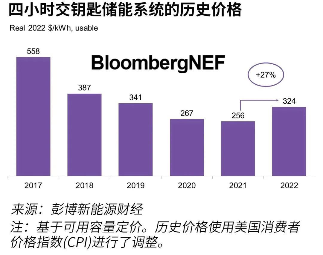 彭博新能源財(cái)經(jīng)2022年調(diào)研的交鑰匙儲(chǔ)能系統(tǒng)價(jià)格區(qū)間為每千瓦時(shí)212美元至575美元,四小時(shí)系統(tǒng)的全球平均價(jià)格比去年上漲27%至每千瓦時(shí)324美元。原材料和零部件價(jià)格上漲導(dǎo)致了儲(chǔ)能系統(tǒng)價(jià)格上漲,這也是自彭博新能源財(cái)經(jīng)于2017年開始調(diào)研以來的首次上漲。預(yù)計(jì)成本將在2023年保持高位,然后在2024年下降。本報(bào)告匯總了提交的185份調(diào)研數(shù)據(jù),并且包括彭博新能源財(cái)經(jīng)對(duì)儲(chǔ)能成本的最新展望。