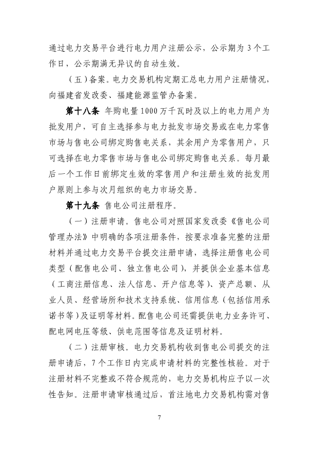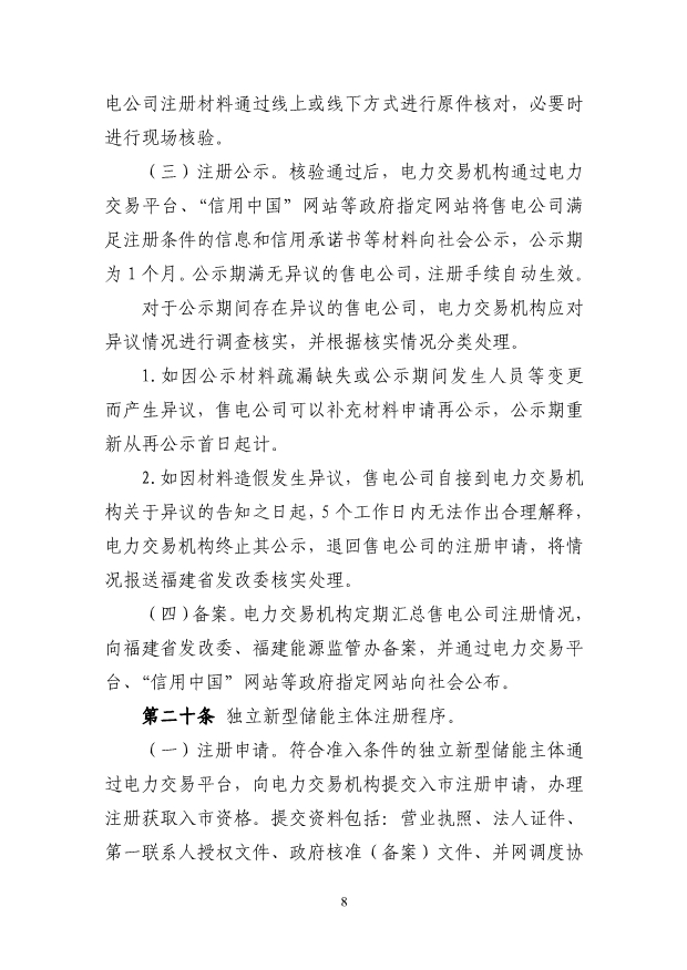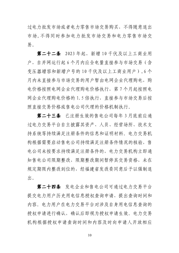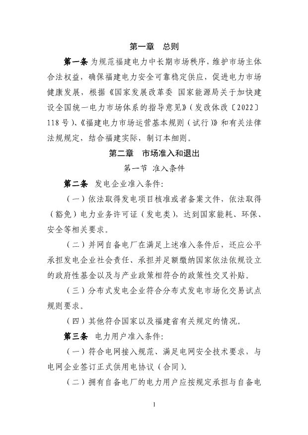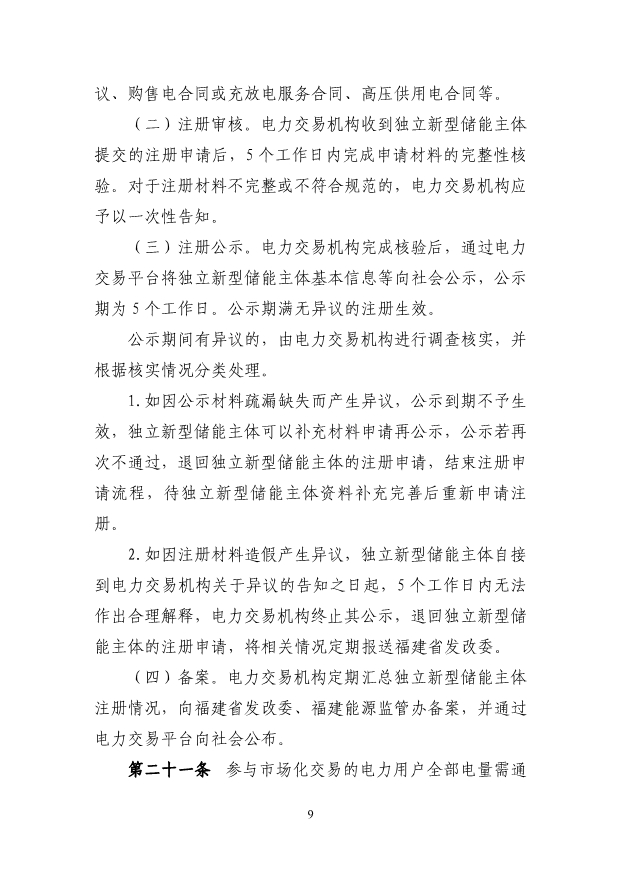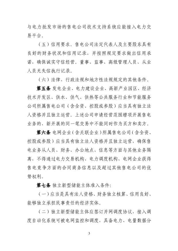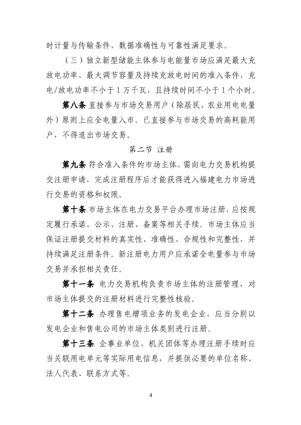 (三)獨立新型儲能主體參與電能量市場應(yīng)滿足最大充 放電功率、最大調(diào)節(jié)容量及持續(xù)充放電時間的準(zhǔn)入條件,充 電/放電功率不小于 1 萬千瓦,且持續(xù)時間不小于 1 個小時。 第八條 直接參與市場交易用戶(除居民、農(nóng)業(yè)用電電量 外)原則上應(yīng)全電量入市。已直接參與市場交易的高耗能用 戶,不得退出市場交易。