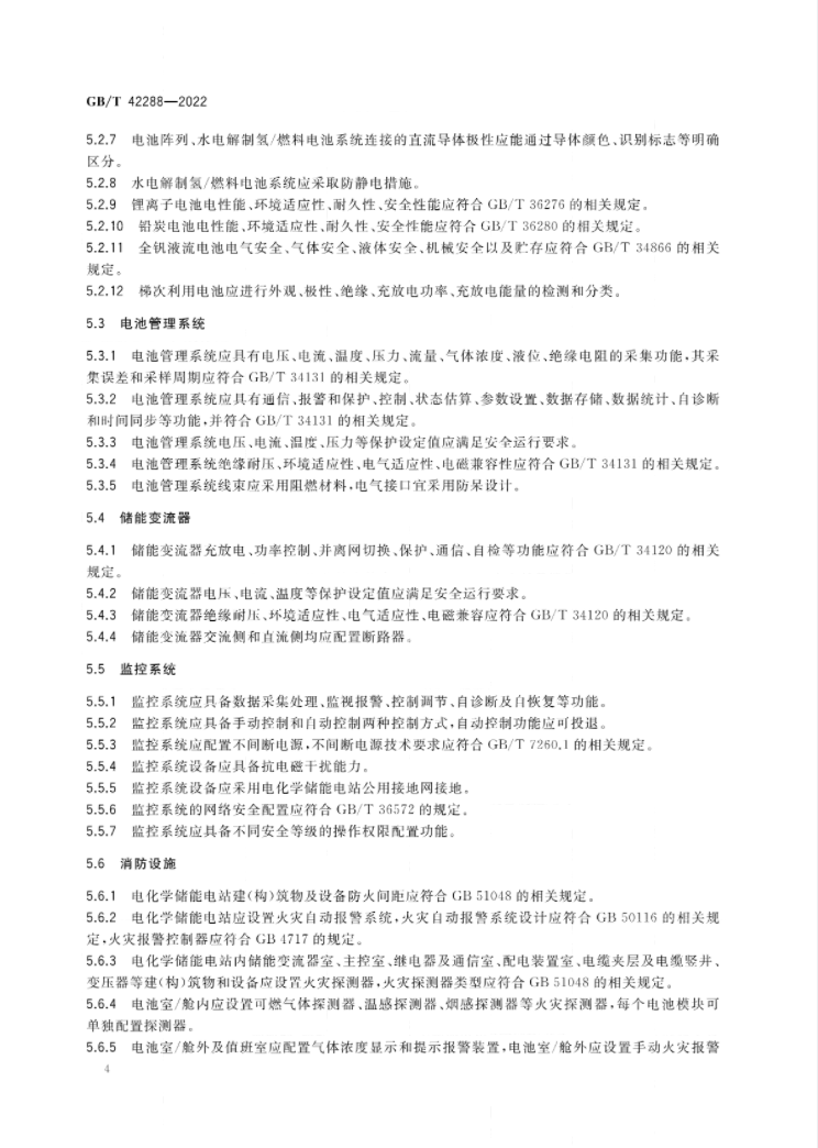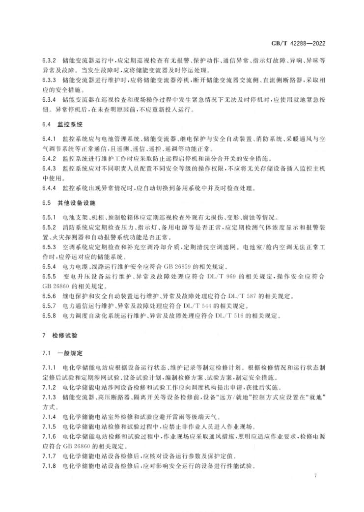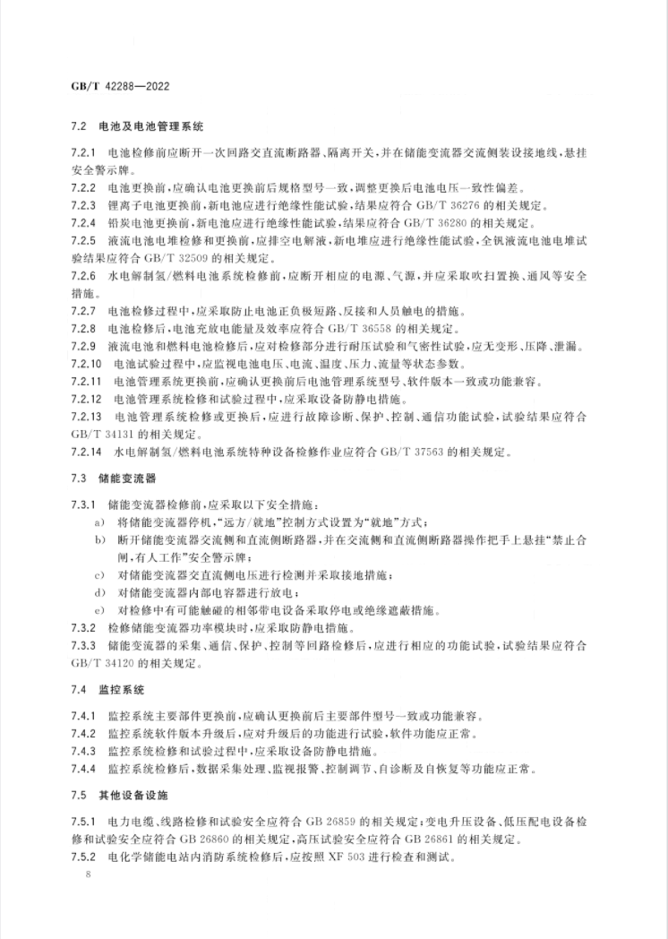 文件適用于鋰離子電池、鉛酸(炭)電池、液流電池、水電解制氫/燃料電池儲能電站。該標(biāo)準(zhǔn)規(guī)定了電化學(xué)儲能電站設(shè)備設(shè)施安全技術(shù)要求、運行、維護(hù)、檢修、試驗等方面的安全要求,涉及儲能電池、BMS、PCS、監(jiān)控、消防等各類設(shè)備的檢修規(guī)定。