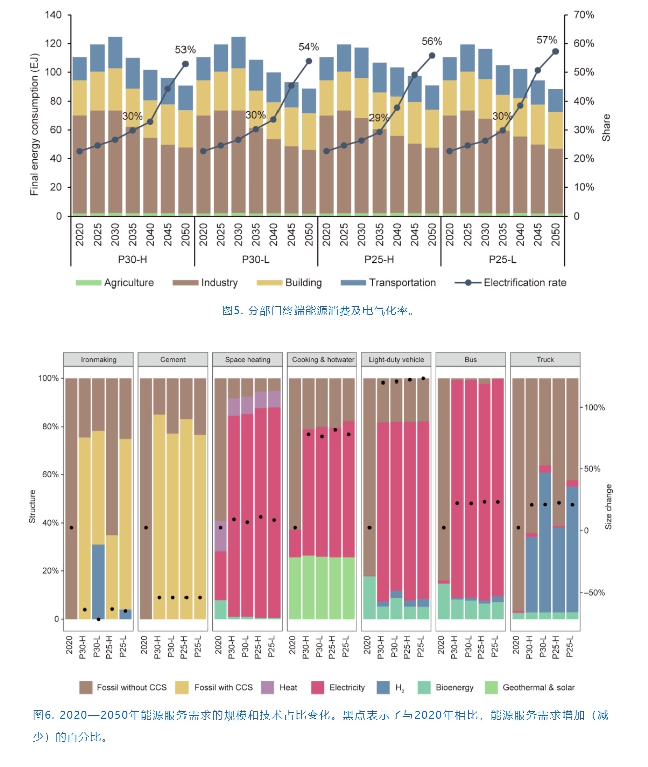 產(chǎn)業(yè)結(jié)構(gòu)調(diào)整、能源效率提高和清潔燃料替代是能源需求部門能耗和排放下降的三大支柱。據(jù)估計(jì),第二產(chǎn)業(yè)在國民經(jīng)濟(jì)中的比重逐年下降,到2050年,這一比重將比2020年減少約9%,而第三產(chǎn)業(yè)比重將增加10%。如圖5所示,對于P30情景,中國的終端能源消費(fèi)將在2030年以125 EJ達(dá)峰,而對于P25情景,達(dá)峰時(shí)間將提前到2025年左右,峰值水平也略低(119 EJ)。兩組情景都顯示,2050年中國終端能源消費(fèi)將穩(wěn)定在90 EJ左右。未來的30年,電氣化率將持續(xù)上升,從目前的23%增加到2035年的30%,然后加速達(dá)到2050年的近60%。技術(shù)進(jìn)步和終端能源的電氣化推動(dòng)能源效率的快速提高。在圖6中,部分能源服務(wù)需求的規(guī)模以及技術(shù)占比變化以圖表的形式展示。