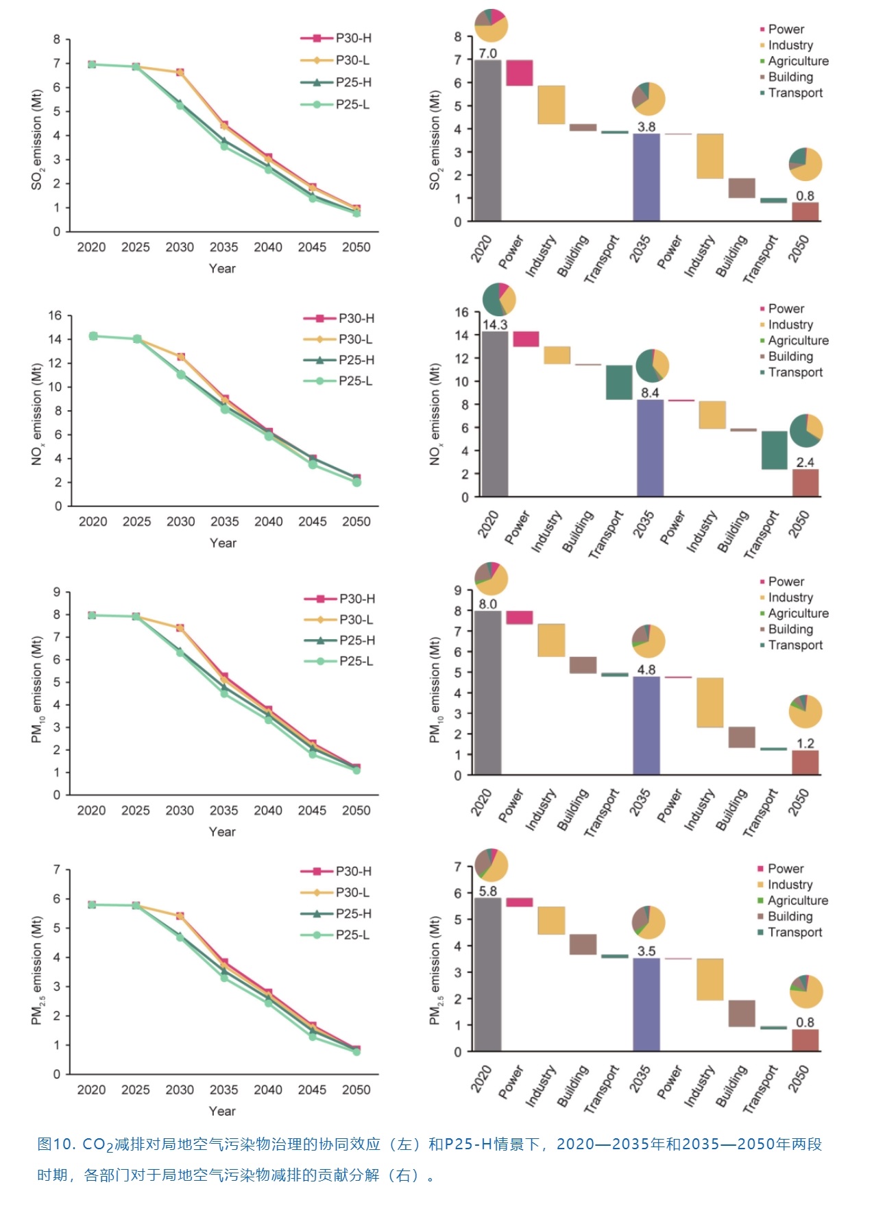 除此之外,能源轉(zhuǎn)型帶來以空氣質(zhì)量改善等為代表的顯著正外部性。在假設(shè)不采取新的局地空氣污染物控制措施情況下,僅通過二氧化碳減排就可以實(shí)現(xiàn)SO2、NOx、PM10和 PM2.5等空氣污染物大幅減少(圖10)。2020年,大部分的SO2來自于工業(yè)和電力部門。SO2排放由2020年的約700萬噸減少到2050年的不足100萬噸(P30)和80萬噸(P25),工業(yè)部門是減排的重點(diǎn)。電力部門的脫碳在2035年之前起到了一定作用,而2035年以后減排主要源于需求部門的燃料替代。到2050年,工業(yè)部門和交通部門是SO2最大的排放者。