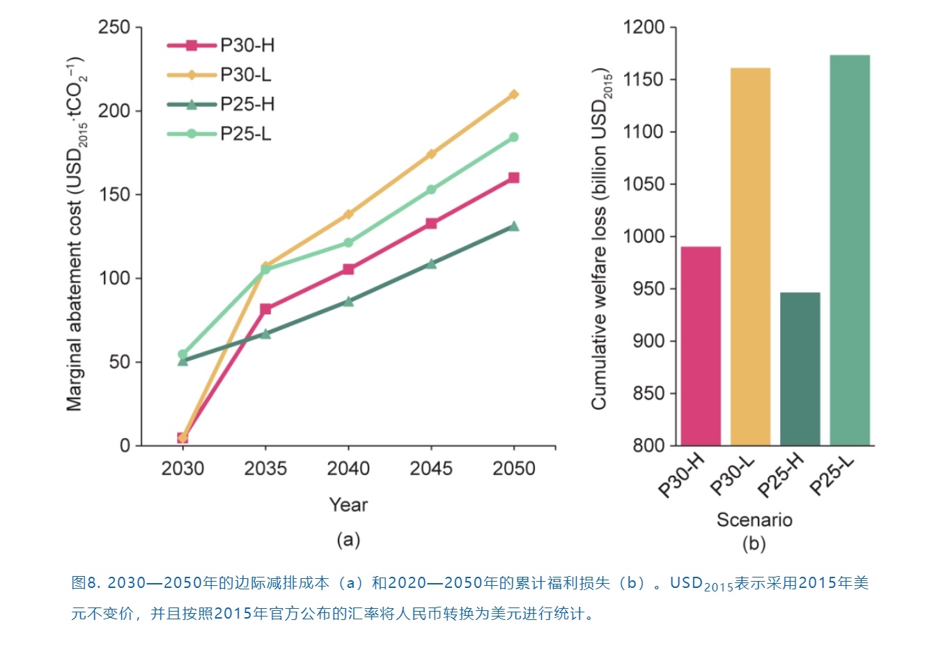 在P30情景下,在2030年實(shí)現(xiàn)國家自主貢獻(xiàn)目標(biāo)需要較小的努力[每噸二氧化碳(t CO2)花費(fèi)5 USD],然而遠(yuǎn)遠(yuǎn)未達(dá)到實(shí)現(xiàn)碳中和所需的努力。在P30-H情景下,2040年的MAC將增加到100 USD·t CO2-1以上;而對于P30-L,2035年的MAC就已經(jīng)超過100 USD·t CO2-1,到2050年將進(jìn)一步突破200 USD·t CO2-1。相比之下,由于P25在2030年已經(jīng)開始實(shí)現(xiàn)碳排放的下降,2030年的MAC約為50 USD·t CO2-1。與P30-L情景類似,P25-L情景也將在2035年達(dá)到100 USD·t CO2-1的MAC,但是后續(xù)的增長將放緩,2050年的MAC為184 USD·t CO2-1。由于P25-H轉(zhuǎn)型壓力最小,2045年以前該情景的MAC都不會(huì)超過100 USD·t CO2-1,到2050年MAC也僅131 USD·t CO2-1。