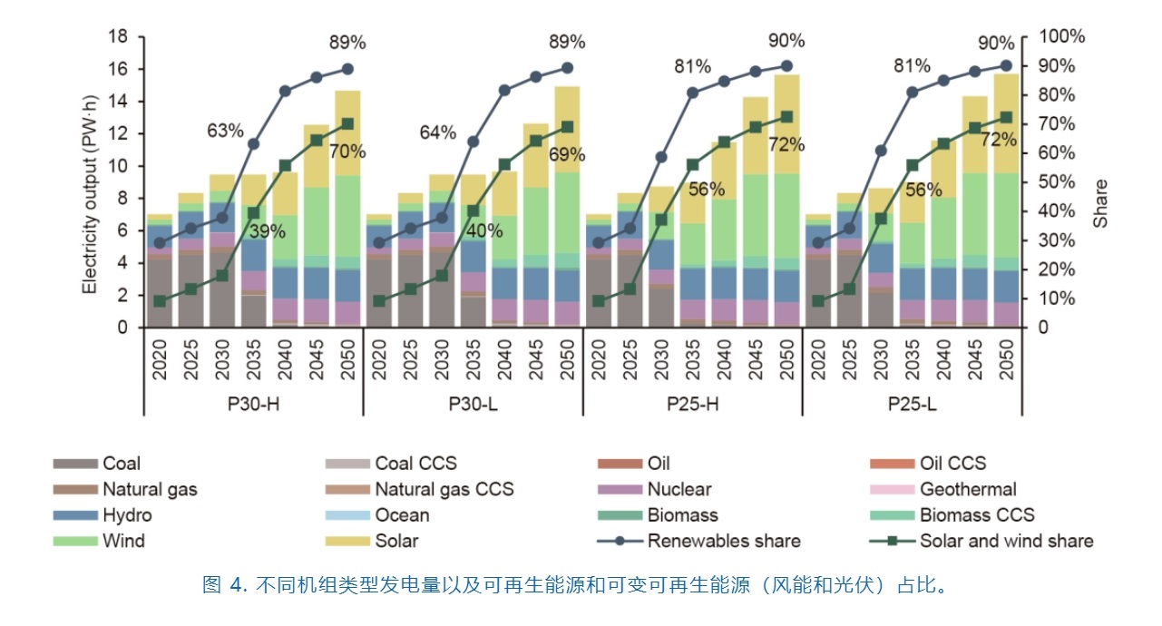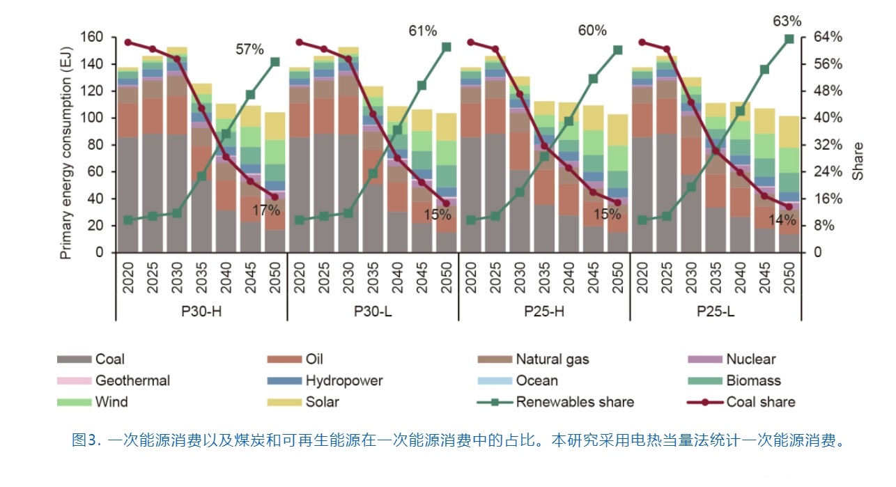 相比之下,可再生能源目前占一次能源消費(fèi)的10%,同時(shí)增長緩慢,主要是為了滿足增量能源需求。未來,可再生能源將最有希望填補(bǔ)由煤炭消費(fèi)下降造成的缺口,從而逐步取代化石燃料。據(jù)測算,在2035—2040年,可再生能源將超越化石燃料,成為中國最主要的能源。到2050年,中國一次能源消費(fèi)中可再生能源比重將達(dá)到約60%。同樣,對于2050年碳預(yù)算較低或者開始減排較早的情景(P25-L、P25-H和P30-L),可再生能源的占比將更高。