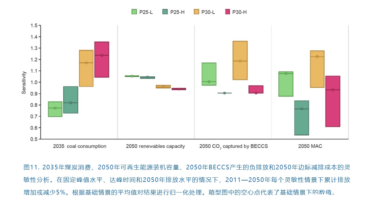 盡管BECCS技術(shù)的部署受到累計(jì)排放量變化的重大影響,但提前達(dá)峰能夠減少對碳移除技術(shù)的依賴并減少由累計(jì)排放量不確定性帶來的波動(dòng)。由于所有部門在2050年都已經(jīng)深度脫碳,因此所有情景都顯示出了對BECCS的巨大需求,其中P25-L和P30-L情景有更高的普及率。與碳移除技術(shù)類似,MAC受到累計(jì)排放量的影響較大。較晚達(dá)峰和更嚴(yán)格的長期排放目標(biāo)都會(huì)增加MAC,產(chǎn)生更大的減排壓力,提前達(dá)峰能夠在實(shí)現(xiàn)長期目標(biāo)中占據(jù)主動(dòng)地位。