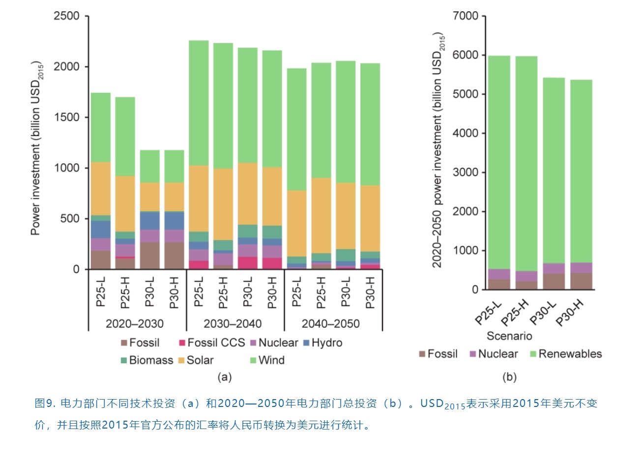 中國持續(xù)的清潔能源投資為低碳轉(zhuǎn)型提供了堅(jiān)實(shí)的基礎(chǔ)。為了實(shí)現(xiàn)中國的碳中和目標(biāo),需要大幅擴(kuò)大低碳投資規(guī)模,并不斷提高綠色投資比重。如圖9所示,從現(xiàn)在到2050年,大約需要6萬億美元的電力投資來支持電力系統(tǒng)的低碳轉(zhuǎn)型,其中可再生能源投資約占90%??偟膩碚f,不同的碳中和時(shí)間對于電力行業(yè)的投資額影響不大,但不同的碳達(dá)峰時(shí)間對其投資有較大影響。未來10年是能源轉(zhuǎn)型和升級的重要窗口期,P25情景下,電力部門年均投資額超過1700億美元,而P30情景下投資額則不足1200億美元。最大的投資缺口在于風(fēng)能和太陽能發(fā)電技術(shù),預(yù)期P25情景(超過1.2萬億美元)近十年的風(fēng)能和太陽能投資是P30情景的兩倍。如果在2030年前沒有采取強(qiáng)有力的行動(dòng),則在未來10年可能還會(huì)新建大量未加裝CCS技術(shù)的火力發(fā)電廠,從而增加了碳鎖定和資產(chǎn)擱置的風(fēng)險(xiǎn)。2030年以后,每年仍將有超過2000億美元的電力投資,而沒有加裝CCS的火力發(fā)電廠將幾乎不再發(fā)展。