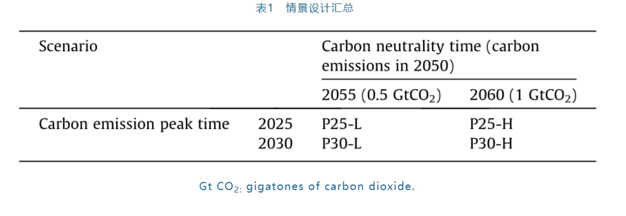 為了更加全面地評估能源轉(zhuǎn)型的影響,一些研究將研究邊界擴(kuò)大到整個(gè)能源系統(tǒng)。已有研究通過整合國家政策和技術(shù)發(fā)展預(yù)期,建立了自上而下的減排目標(biāo),并預(yù)測了不同政策下二氧化碳的排放量。目前也有一些研究評估了碳減排對空氣質(zhì)量、能源安全和水資源節(jié)約方面的協(xié)同效益。然而,這些研究都按照以往的2 ℃或1.5 ℃溫升控制目標(biāo)設(shè)計(jì)情景,并沒有以碳中和目標(biāo)為導(dǎo)向。