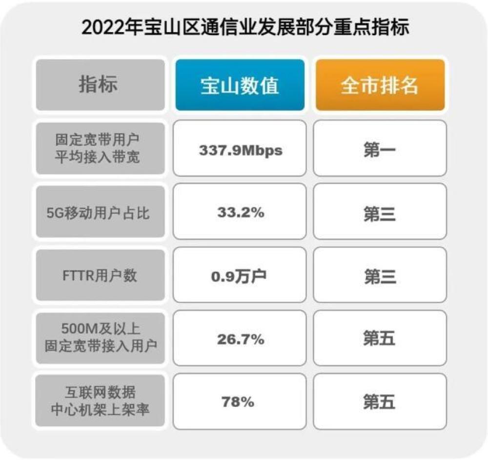 近日,市通信管理局發(fā)布《2022年上海市各行政區(qū)通信業(yè)發(fā)展重點指標》,該指標共計8項,寶山5項指標進入全市前五,其中,寶山固定寬帶用戶平均接入帶寬位列全市第一,5G移動用戶、FTTR用戶數占比排名全市第三。