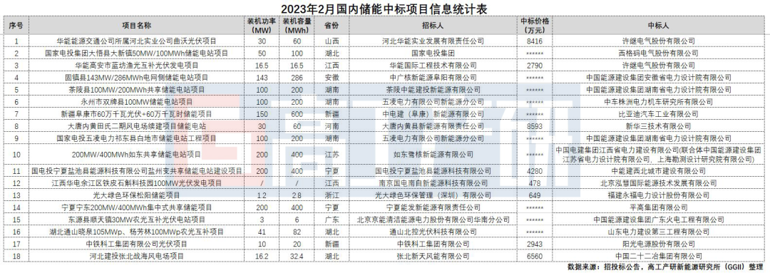 GGII:2月共18個儲能項目公布中標(biāo)結(jié)果 規(guī)模合計1.39GW/3.06GWh