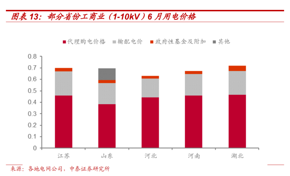 此前,關(guān)于儲(chǔ)能充電是否需承擔(dān)輸配電價(jià)等費(fèi)用,各地沒(méi)有明確統(tǒng)一的標(biāo)準(zhǔn)。《通知》特別指出,獨(dú)立儲(chǔ)能電站向電網(wǎng)送電的,其相應(yīng)充電電量不承擔(dān)輸配電價(jià)和政府性基金及附加,這一規(guī)定將大幅降低儲(chǔ)能充電成本。我們統(tǒng)計(jì)了部分省份2022年6月代理購(gòu)電的用電價(jià)格,輸配電價(jià)和政府性基金及附加合計(jì)占用電價(jià)格的比例超過(guò)30%,以江蘇省為例,代理購(gòu)電價(jià)格、輸配電價(jià)、政府性基金及附加分別為0.4594、0.2110、0.0294 元/kWh,輸配電價(jià)及政府性基金占用電價(jià)格比例為 34.35%。若儲(chǔ)能充電需支付這兩部分費(fèi)用,將大幅提高充電成本,因此這一規(guī)定將明確儲(chǔ)能項(xiàng)目邊界條件,保障儲(chǔ)能合理收益,提高儲(chǔ)能投資意愿。