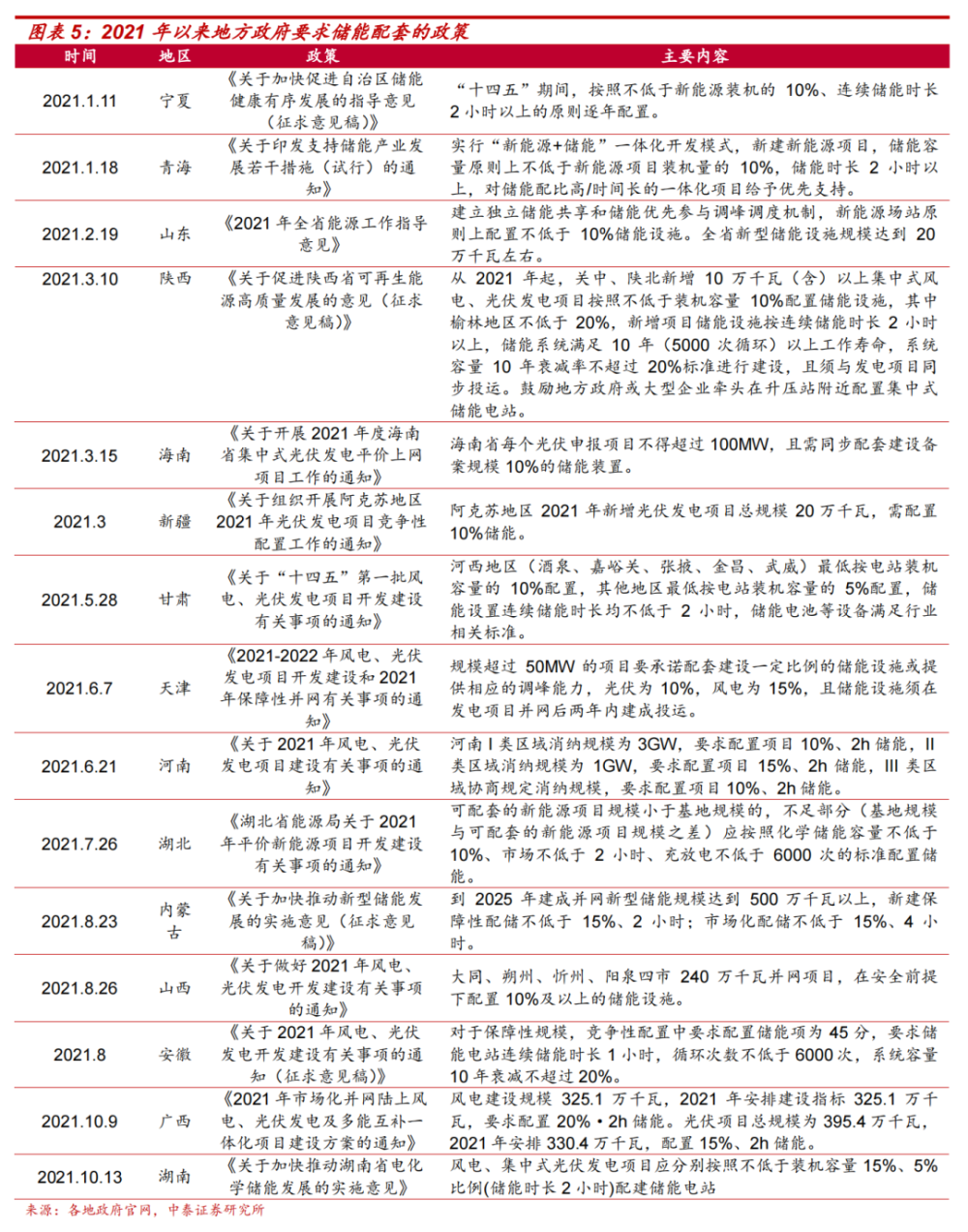 2021年起,各省密集發(fā)布新能源項(xiàng)目配套儲(chǔ)能政策,配臵比例主要在 10%-20%區(qū)間,配臵時(shí)長(zhǎng)1-2小時(shí),推動(dòng)我國(guó)電化學(xué)儲(chǔ)能高速增長(zhǎng)。根據(jù)《2022儲(chǔ)能產(chǎn)業(yè)研究報(bào)告》,2021年我國(guó)新能源配儲(chǔ)占電化學(xué)儲(chǔ)能應(yīng)用的45.40%,我國(guó)電化學(xué)儲(chǔ)能主要應(yīng)用在電源側(cè)和電網(wǎng)側(cè)來(lái)支持風(fēng)光新能源消納和新型電力系統(tǒng)建設(shè)。