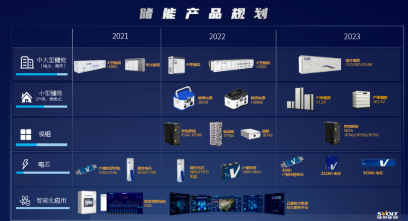 在產(chǎn)品上,目前產(chǎn)品包含全序列中大型儲能(電力和商用側)、小型儲能(戶用、便攜式儲能)、模組、各類規(guī)格儲能電芯以及智能化應用系統(tǒng)和平臺,滿足客戶在發(fā)電側、電網(wǎng)側、用戶側的儲能及能源管理需求。