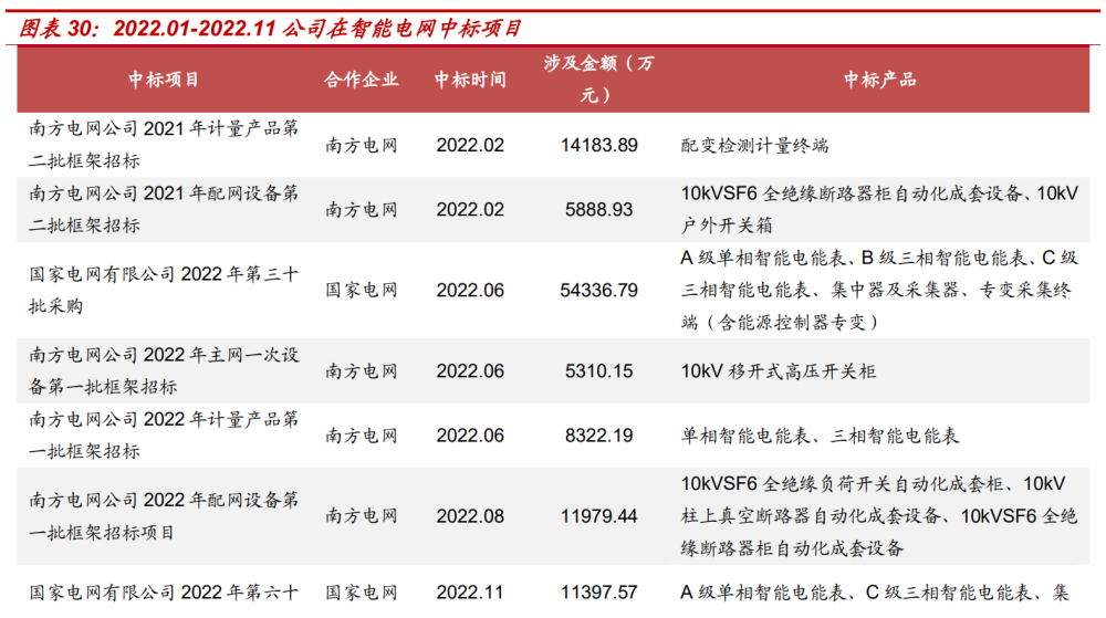 公司海內(nèi)外訂單飽滿,預(yù)計(jì)未來業(yè)績將持續(xù)放量。在 2021 年,科陸 電子智能電表產(chǎn)品和用電信息采集終端產(chǎn)品系列的總中標(biāo)金額約 9.1 億元,以中標(biāo)額計(jì)算的整體市場占有率達(dá)到約 2.67%。其中,公司在 國家電網(wǎng)招標(biāo)采購項(xiàng)目中標(biāo)約 5.96 億元,在南方電網(wǎng)計(jì)量產(chǎn)品框架招 標(biāo)項(xiàng)目中標(biāo)約 2.19 億元,在各省電網(wǎng)公司 2021 年計(jì)量箱招標(biāo)項(xiàng)目 中標(biāo)約 1.69 億元。自 2022 年起,上半年中,公司在國網(wǎng)第一次電能 表招標(biāo)及南網(wǎng)第一批框架招標(biāo)中占比達(dá) 4.1%、5.6%,位列中標(biāo)金額的 第一梯隊(duì),成功實(shí)現(xiàn)在兩網(wǎng)市場份額占比提升;截至 11 月,公司已實(shí) 現(xiàn) 5 次中標(biāo),中標(biāo)總金額達(dá) 11.14 億元,同比 2021 年中標(biāo)總金額 7.44 億元,公司國內(nèi)訂單量實(shí)現(xiàn)大幅提升。海外方面,公司持續(xù)在海外電表 業(yè)務(wù)深耕,業(yè)務(wù)主要集中在非洲、亞太、南美等地區(qū),并在歐洲、美洲 多個(gè)國家實(shí)現(xiàn)業(yè)績突破。