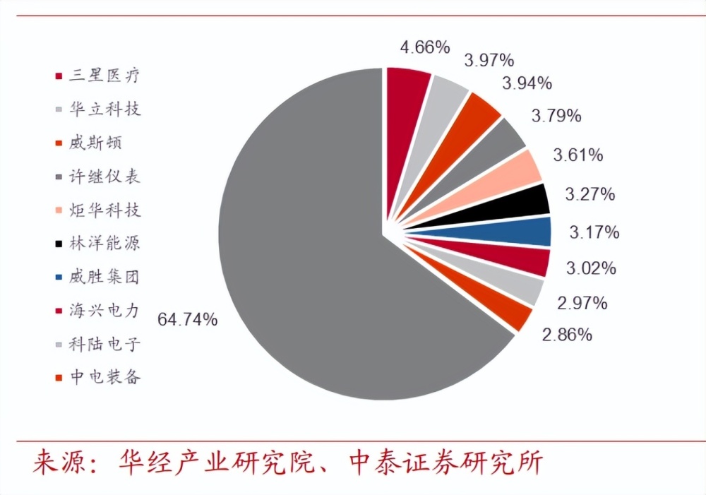 智能電表行業(yè)處于充分競爭狀態(tài),市占率穩(wěn)定。參與智能電表及用電信 息集中采集招標(biāo)的企業(yè)數(shù)量較多,國家電網(wǎng)智能電表及用電信息采集系 統(tǒng)招標(biāo)入圍公司已超過百家,集中度較低,第一梯隊(duì)三星醫(yī)療、東方威 斯頓、許繼電氣、炬華科技市占率維持在 3%-5%左右。長期來看,市場 訂單分散,我國智能電表行業(yè)競爭格局趨于穩(wěn)定。在 2022 年第一批智 能電表中標(biāo)中,三星醫(yī)療、東方威思頓、科陸電子、許繼、華立科技分 別占比 5.1%、4.8%、4.1%、4.1%、4.1%,其中,科陸電子中標(biāo)份額 較 2021 年有較大提升。