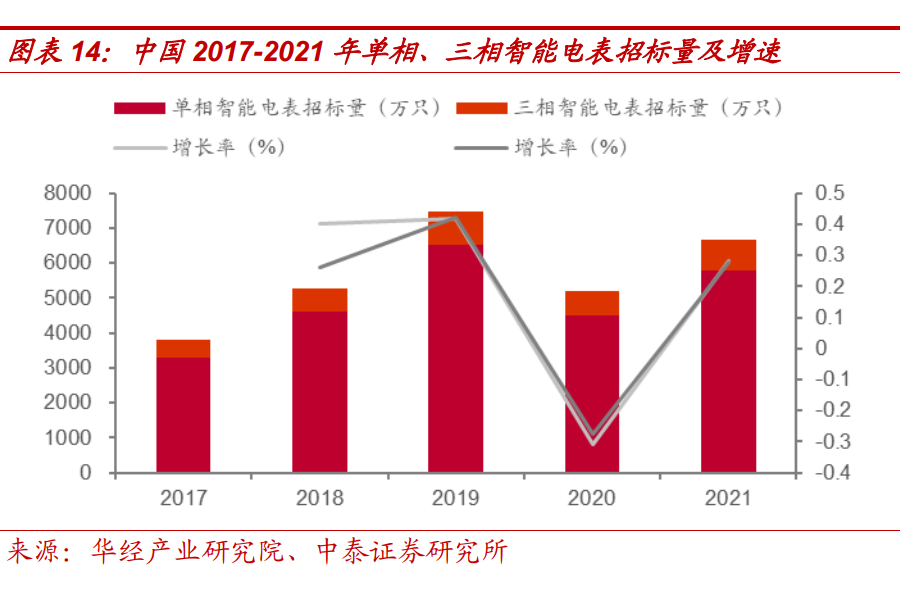 智能電表需求觸底反彈,招標(biāo)量整體保持上升趨勢。我國智能電表市場 需求主要來源于國家電網(wǎng)和南方電網(wǎng),2020 年受疫情影響國網(wǎng)建設(shè)進(jìn)度 放緩,因此單相、三相智能電表招標(biāo)量同比下降 30.8%、27.5%。隨疫 情好轉(zhuǎn),市場需求恢復(fù),智能電網(wǎng)招標(biāo)量觸底反彈,單相、三相智能電 表招標(biāo)量同比上升 28.3%、27.7%,其中國家電網(wǎng)招標(biāo)量達(dá) 6674 萬只, 同比增長 28%,南方電網(wǎng)招額達(dá) 26 億元,同比增長 49.8%。