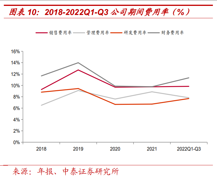 期間費(fèi)用呈下降趨勢,但仍有較大進(jìn)步空間。2019-2021 年公司期間費(fèi) 用率分別為 36.3%/45.3%/33.8%/35.1%/36.7%,雖然呈現(xiàn)總體下降趨勢, 但仍高于同行平均值,費(fèi)用管控能力有望進(jìn)一步提升。其中 2022 年前 三季度銷售/管理/研發(fā)/財(cái)務(wù)費(fèi)用率分別為 9.8%/7.8%/7.7%/11.3%,打破 前兩年的下降趨勢,主要是因?yàn)楣臼杖塍w量較低,規(guī)模效應(yīng)尚未體現(xiàn), 且公司近年來營運(yùn)資金緊缺,導(dǎo)致公司主動(dòng)放棄大量周期長、墊資金額高的訂單,也限制了營收規(guī)模的增長,導(dǎo)致各方面人效降低。但隨著公 司業(yè)務(wù)擴(kuò)張的不斷推進(jìn)和資金鏈的緩解,期間費(fèi)用率有望好轉(zhuǎn)。