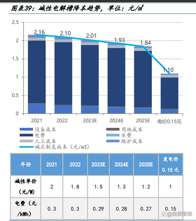 (2)從發(fā)展階段來看,示范階段更注重初裝成本,商業(yè)化運營需考慮全生命周期成 本。當(dāng)前電解水項目大多處于示范階段,堿性電解槽技術(shù)更成熟、設(shè)備價格也相對更 低,示范階段更傾向于堿性電解槽的應(yīng)用。未來進入商業(yè)化運營時,全生命周期成本 成為首要考慮因素,即需加入運營成本進行考量,堿性電解槽運營成本占其全生命周 期成本的 75%-80%,PEM 則是占 30-40%,在 PEM 電解槽設(shè)備逐年降本以及其更適合與 風(fēng)光耦合的情況下,PEM 電解槽的應(yīng)用將呈現(xiàn)逐年上升趨勢。