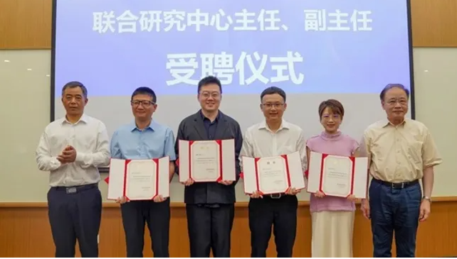 中國科學院院士馬余剛(左一)、褚君浩(右一)為聯(lián)合研究中心負責人頒發(fā)聘書