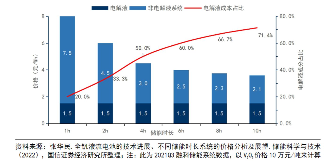 從經(jīng)濟性上看,全釩液流電池儲能的初始投資成本在2.5元-7.5元/Wh,時長越大,單瓦時的投建成本越低,8小時以上可以降到2元/Wh左右,接近鋰電儲能。而且,全釩液流電池的壽命長達20年,是鋰電池的2倍,這進一步攤低了初始投資的單位成本,成本更優(yōu)于鋰電儲能系統(tǒng)。即便是20年壽命到期,釩液流電池電解液的殘值和循環(huán)利用價值也高達30%以上,全生命周期成本更低。未來,隨著更多全釩液流電池儲能項目的上馬,很容易在市場層面引發(fā)共鳴。
