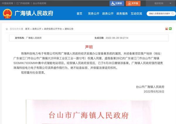 臺(tái)山市廣海鎮(zhèn)人民政府在2022年6月28日發(fā)布的一則聲明顯示:珠??苿?chuàng)電力電子有限公司(目前已更名為“珠??苿?chuàng)儲(chǔ)能科技有限公司”)利用廣海鎮(zhèn)人民政府經(jīng)濟(jì)發(fā)展辦公室備案系統(tǒng)的漏洞,未經(jīng)備案項(xiàng)目落戶地塊權(quán)屬人同意,虛假備案28億的廣東省江門市臺(tái)山市廣海鎮(zhèn)500MW/1000MWh集中式儲(chǔ)能電站項(xiàng)目。聲明稱,該鎮(zhèn)已于2022年6月28日撤銷該備案。
