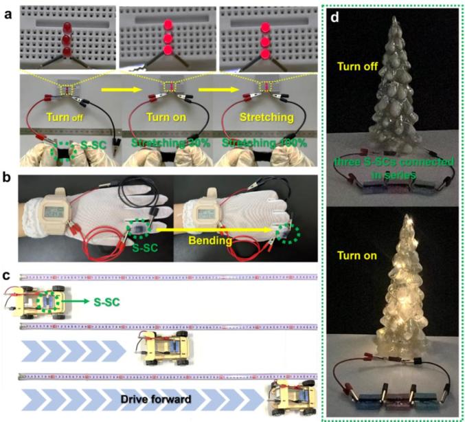 綜上所述,G-PANI@pcPU電極具有相互連接的多孔骨架、開放的離子遷移/插層通道、高機(jī)械柔性和大規(guī)模制備等優(yōu)勢(shì)。在三電極系統(tǒng)中表現(xiàn)出超大的面積電容與贗電容可調(diào)性能。構(gòu)筑的G-PANI@pcPU可拉伸超級(jí)電容器(S-SCs)具有高能量密度、大比電容和優(yōu)異的可拉伸循環(huán)穩(wěn)定性,并實(shí)現(xiàn)了在高拉伸形變條件下為電子器件穩(wěn)定供電的應(yīng)用。