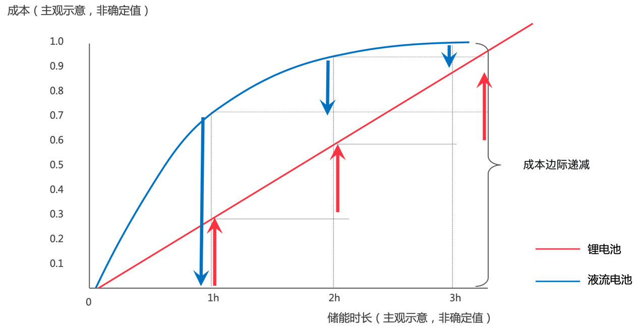 相較動輒發(fā)生安全事故的鋰電池,液流電池不燃燒、不爆炸,本征安全優(yōu)勢突出。其儲能時長大于2小時,使用壽命超過20年,循環(huán)次數(shù)超過15000次等優(yōu)勢,更適合未來大量使用新能源的電網(wǎng),也被視為最適合長時儲能的電池技術(shù)之一。并且,隨著儲能時長的增加,液流電池的投資成本邊際遞減。