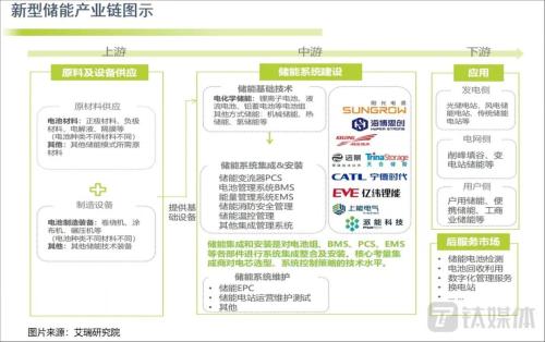 根據(jù)艾瑞研究院的梳理,儲(chǔ)能產(chǎn)業(yè)鏈的上游主要是電池材料的原材料供應(yīng)商和制造商;中游則是系統(tǒng)建設(shè)環(huán)節(jié),包括基礎(chǔ)技術(shù)、系統(tǒng)集成安裝和系統(tǒng)運(yùn)維三大部分,市場(chǎng)中最知名的寧德時(shí)代、億鋰緯能、陽光電源、天合光能等都處于中游;下游則是發(fā)電側(cè)、電網(wǎng)側(cè)、用戶側(cè)的應(yīng)用及服務(wù)。