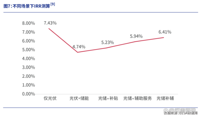 以內(nèi)蒙古某100MW光伏發(fā)電項(xiàng)目、配套20MW/40MWh儲(chǔ)能電站為例,在僅光伏發(fā)電的情景下,內(nèi)部收益率高達(dá)7.43%,光伏+儲(chǔ)能的情景下,內(nèi)部收益率降至4.74%,而如果是光伏+儲(chǔ)能+補(bǔ)貼的情景下,內(nèi)部收益率可達(dá)5.23%;“光伏+儲(chǔ)能+輔助服務(wù)”內(nèi)部收益率可達(dá)5.94%;“光伏+儲(chǔ)能+補(bǔ)貼+輔助服務(wù)”,內(nèi)部收益率更是高至6.41%。
