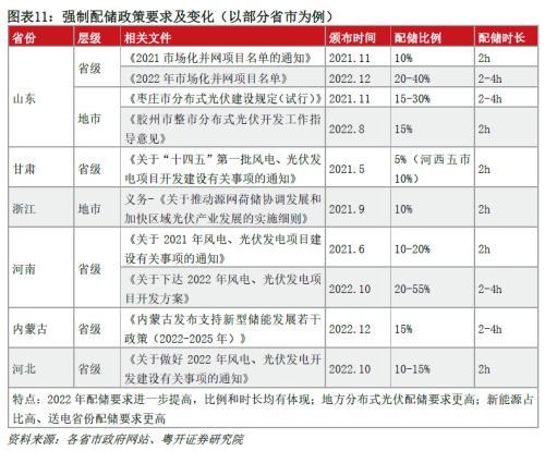 強制配儲政策客觀上拉動儲能裝機需求。2021年2月,國家發(fā)改委、能源局出臺《關(guān)于推進(jìn)電力源網(wǎng)荷儲一體化和多能互補發(fā)展的指導(dǎo)意見》,明確增量風(fēng)光儲一體化要優(yōu)化配套儲能規(guī)模,充分發(fā)揮儲能調(diào)峰、調(diào)頻作用。5月出臺的《關(guān)于2021年風(fēng)電、光伏發(fā)電開發(fā)建設(shè)有關(guān)事項的通知》也指出保障性并網(wǎng)以外的項目,需通過自建、合建共享或購買服務(wù)等市場化方式落實并網(wǎng)條件后并網(wǎng)。自此,多地相繼發(fā)布電源側(cè)風(fēng)光強制配儲政策,多要求10%/2h的配置比例和時長,并且政策要求逐漸向15-30%和4-5h的高比例、長時儲能發(fā)展。事實上,多地風(fēng)光項目招標(biāo)競爭過程中,實際配儲情況高于政策要求。