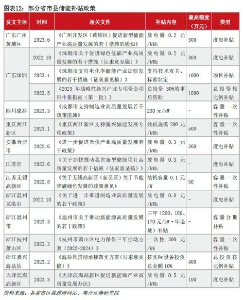 2、行業(yè)價格政策方面,地補政策和電價政策持續(xù)改善收益端。儲能行業(yè)補貼政策以地方補貼為主,包括度電補貼和投資補貼兩種。各地為吸引儲能投資、加快當(dāng)?shù)貎δ苄袠I(yè)發(fā)展,其補貼力度較高,政策出臺層級細(xì)分至縣區(qū)級,充分體現(xiàn)儲能行業(yè)發(fā)展高景氣。長期來看市場化體制機制是保障儲能發(fā)展的關(guān)鍵,電價政策正是盈利機制的主要影響因素,近年來我國儲能發(fā)展相關(guān)的電價政策在不斷完善中。
