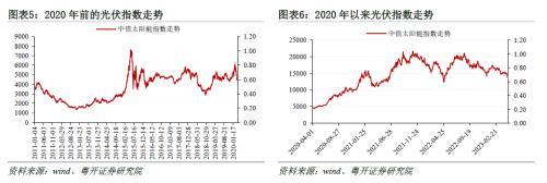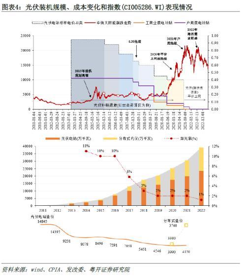 3、具體來看:1)風(fēng)電呈現(xiàn)周期性行情:三上漲與兩回調(diào)交錯,對應(yīng)行業(yè)擴張與嚴(yán)監(jiān)管交替。風(fēng)電周期性行情與行業(yè)供需均衡情況相匹配,行業(yè)快速擴張或增速放緩背后的原因在于政策引導(dǎo)或限制需求,復(fù)盤風(fēng)電發(fā)展和指數(shù)表現(xiàn),我們發(fā)現(xiàn)風(fēng)電行情周期大約在5年左右,每2-3年進(jìn)行一次峰谷切換。2)光伏“四上一下”行情:規(guī)劃、補貼和需求是驅(qū)動因素。單復(fù)盤光伏指數(shù)走勢,光伏1-2年出現(xiàn)一波行情,但結(jié)合行業(yè)監(jiān)管和企業(yè)出清來看,光伏產(chǎn)業(yè)發(fā)展和行情周期仍為5年左右,期間受補貼退坡等事件驅(qū)動,指數(shù)出現(xiàn)階段性行情。