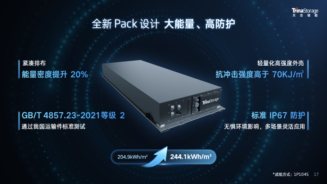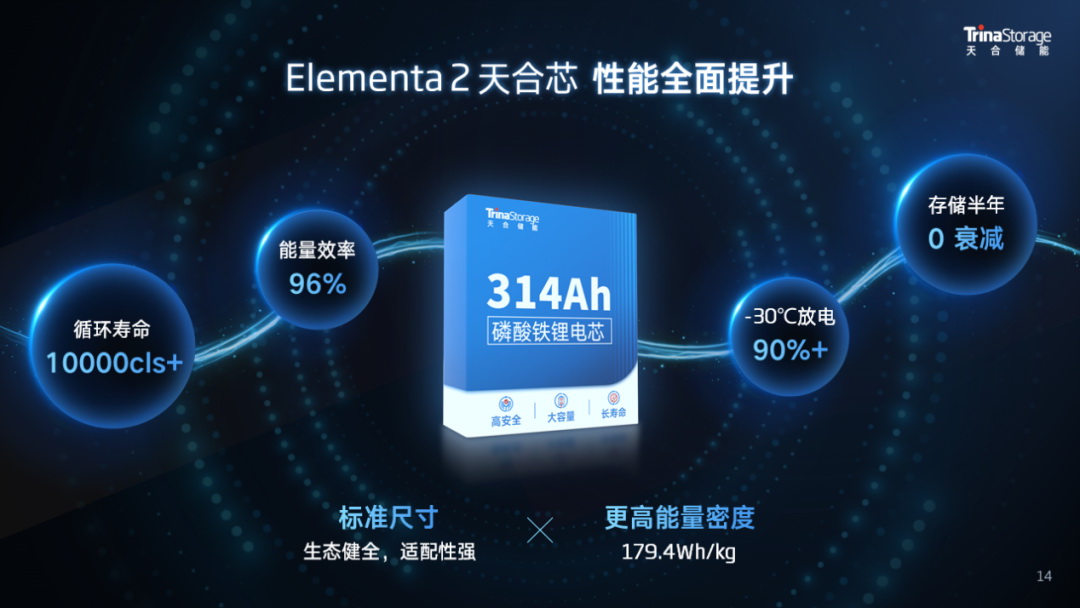 通過優(yōu)化電芯結(jié)構(gòu)和智造工藝,天合自研高安全、高能量密度的314Ah儲能專用電芯,循環(huán)壽命可達10000cls+,能量密度179.4Wh/kg,能量效率高達96%,同時采用主流標準的71173尺寸,完美適配當前主流系統(tǒng)集成方案,實現(xiàn)同尺寸下系統(tǒng)能量的顯著提升。