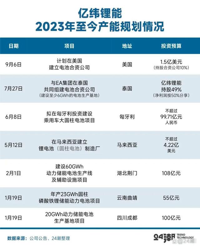 另據(jù)24潮團(tuán)隊(duì)統(tǒng)計(jì),在5月、6月和7月億緯鋰能三次發(fā)布擴(kuò)張公告,其計(jì)劃投入上百億資金在馬來西亞、匈牙利和泰國獨(dú)資或合資建設(shè)電池基地項(xiàng)目,詳見下表