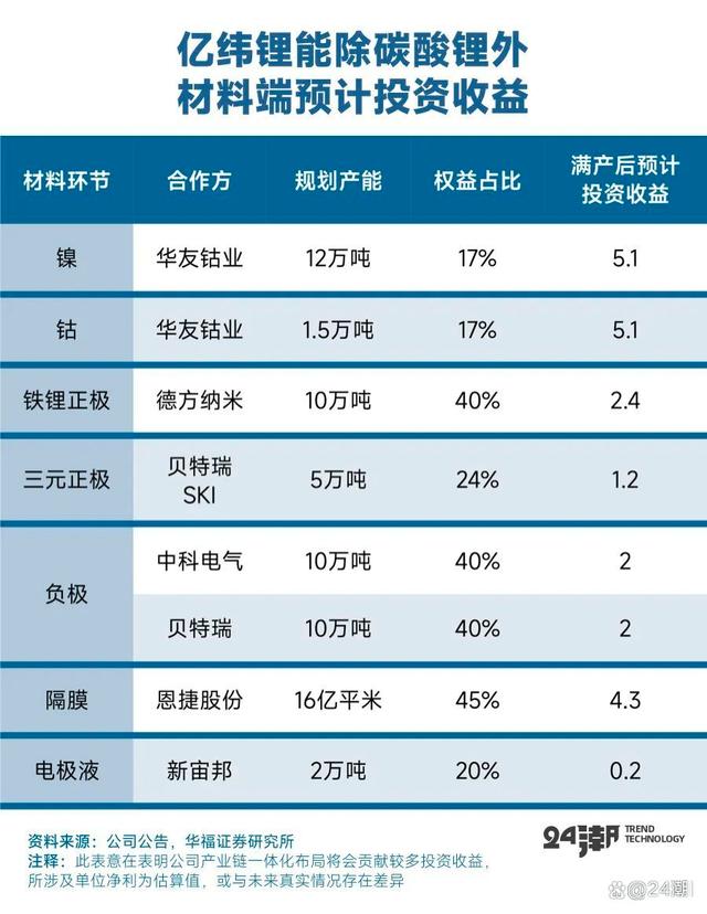 據(jù)華福證券預(yù)測(cè),2022年億緯鋰能碳酸鋰可自供量約為2779噸,自供比列約為14%,未來還將逐年快速提升,至2024年其碳酸鋰自供比例將升至33%,根據(jù)其長(zhǎng)遠(yuǎn)產(chǎn)能規(guī)劃,未來很可能達(dá)到49%;而億緯鋰能在上游鈷鎳、正負(fù)極材料、隔膜以及電解液等材料領(lǐng)域的產(chǎn)業(yè)布局一旦滿產(chǎn)后,預(yù)計(jì)合計(jì)將實(shí)現(xiàn)22.3億元的投資收益。