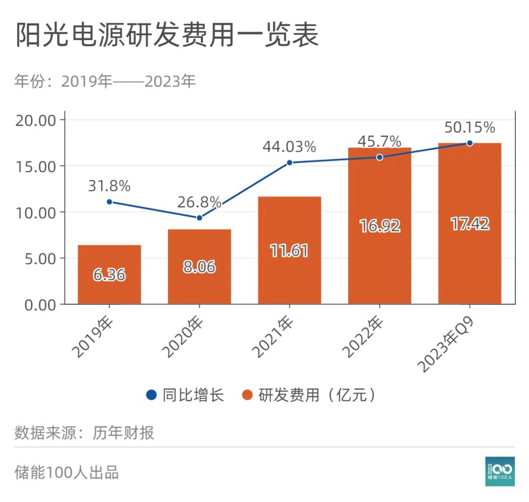 事實(shí)上,陽(yáng)光電源自1997年成立起,26年來(lái)一直不斷加大科研投入,時(shí)刻不忘技術(shù)創(chuàng)新。截至目前,其在合肥、上海、南京、深圳、德國(guó)、荷蘭有六大研發(fā)中心,研發(fā)人員占比40%,2023年前三季度研發(fā)費(fèi)用投入17.42億元。申請(qǐng)專利5300余項(xiàng),持有數(shù)業(yè)內(nèi)第一。