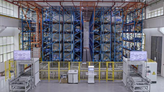 為了更好地提升倉內(nèi)空間利用率,在進(jìn)行現(xiàn)場測量與規(guī)劃后,京東物流通過投入使用堆垛機(jī)、智能升降貨柜、料箱AGV等智能設(shè)備為其進(jìn)行了一系列軟硬件改造升級,最大程度利用場地空間,建設(shè)超萬個儲位,儲位最高可放置重量達(dá)1000公斤的物資。與此同時,京東物流還全面利用人臉識別技術(shù),語音播報、燈光指引、智能墨水屏、重力式感應(yīng)貨架等硬件,部署智能軟件系統(tǒng),實現(xiàn)24小時無人化值守,提高領(lǐng)料效率,確保安全生產(chǎn)。