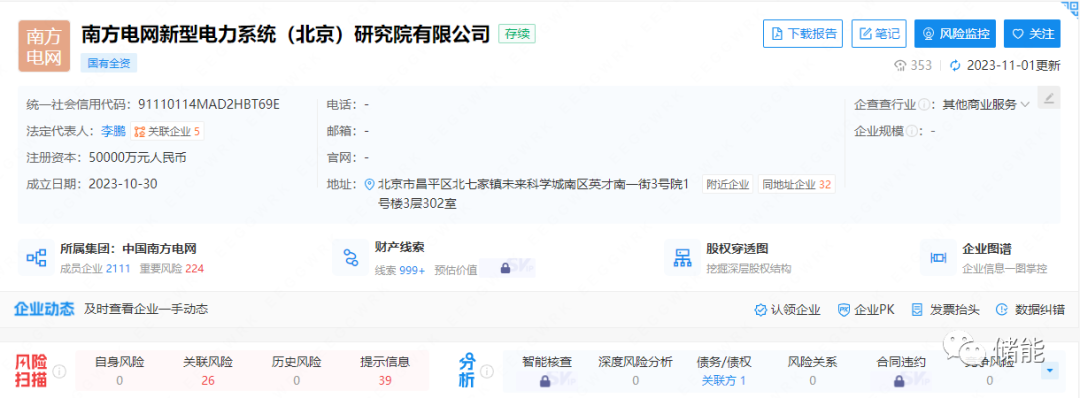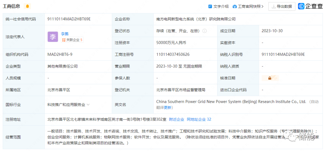 10月30日,南方電網(wǎng)新型電力系統(tǒng)(北京)研究院有限公司注冊成立,法定代表人為李鵬,注冊資本5億元人民幣,該公司由中國南方電網(wǎng)有限責(zé)任公司及旗下南方電網(wǎng)數(shù)字電網(wǎng)集團(tuán)有限公司、南方電網(wǎng)科學(xué)研究院有限責(zé)任公司共同持股。
