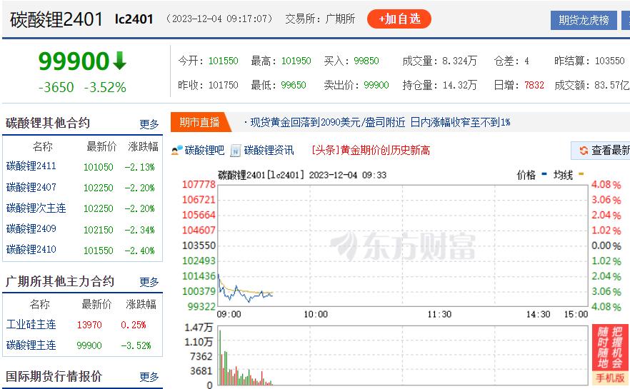 2023年12月4日,碳酸鋰盤中跌破10萬元/噸