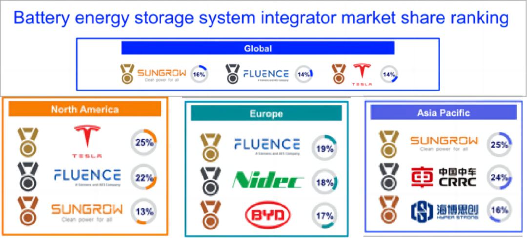 來自Wood Mackenzie的數(shù)據(jù)顯示,2022年,陽光電源以16%的市場份額,將Fluence拉下馬,登上全球第一的鐵王座。Fluence、特斯拉、華為、比亞迪等位列其后,占比分別為14%、14%、9%、9%。