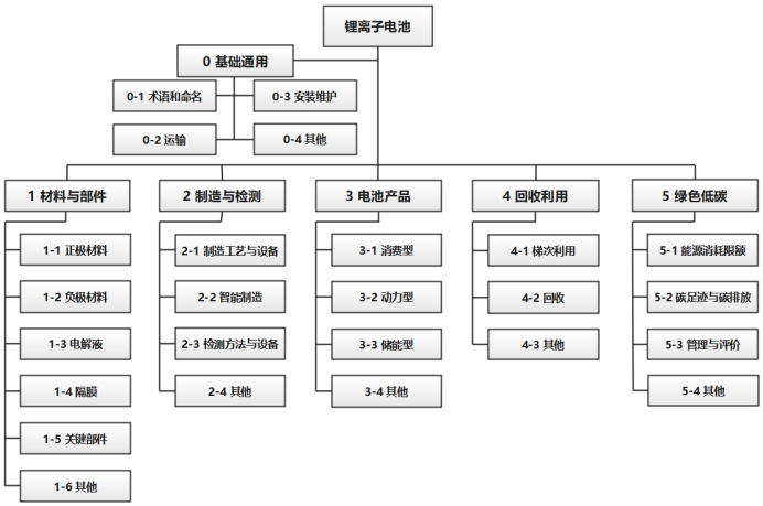 鋰離子電池綜合標(biāo)準(zhǔn)化技術(shù)體系主要包括基礎(chǔ)通用、材料與部件、制造與檢測(cè)、電池產(chǎn)品、回收利用、綠色低碳6大類、25個(gè)小類(見(jiàn)圖2)。
