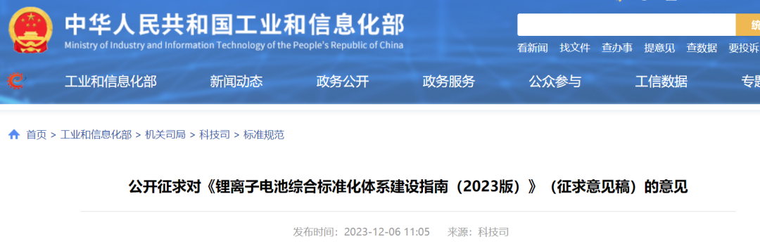 工信部公開(kāi)征求對(duì)《鋰離子電池綜合標(biāo)準(zhǔn)化體系建設(shè)指南(2023版)》(征求意見(jiàn)稿)的意見(jiàn)