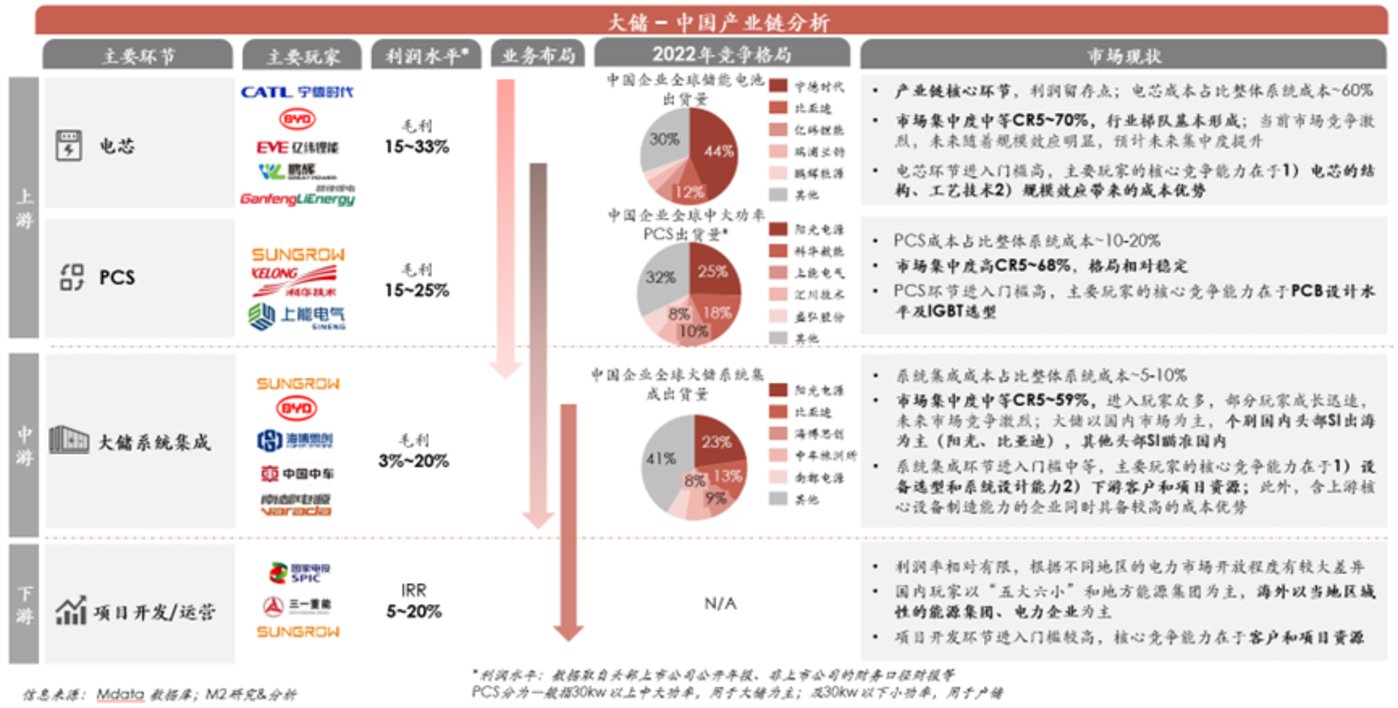 覓途咨詢的調(diào)研顯示,在大儲(chǔ)系統(tǒng)的價(jià)值鏈中,上游設(shè)備制造環(huán)節(jié)是核心的利潤(rùn)留存點(diǎn),技術(shù)壁壘高,新玩家難以進(jìn)入市場(chǎng);中游系統(tǒng)集成環(huán)節(jié)玩家眾多,市場(chǎng)競(jìng)爭(zhēng)激烈,核心競(jìng)爭(zhēng)點(diǎn)在客戶和項(xiàng)目資源開(kāi)發(fā)能力,僅有個(gè)別頭部玩家以出海業(yè)務(wù)為主;未來(lái)伴隨運(yùn)營(yíng)市場(chǎng)成熟IRR提升,更多企業(yè)將向下滲透。