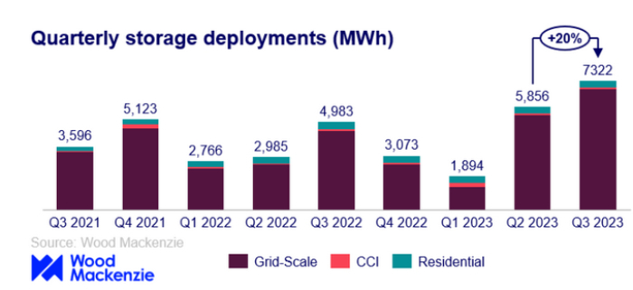 根據(jù)調(diào)研機構(gòu)Wood Mackenzie日前發(fā)布的研究報告,美國儲能行業(yè)又經(jīng)歷了一個破紀錄的季度,在2023年第三季度部署的儲能系統(tǒng)的裝機容量為2354MW,儲能容量為7322MWh。