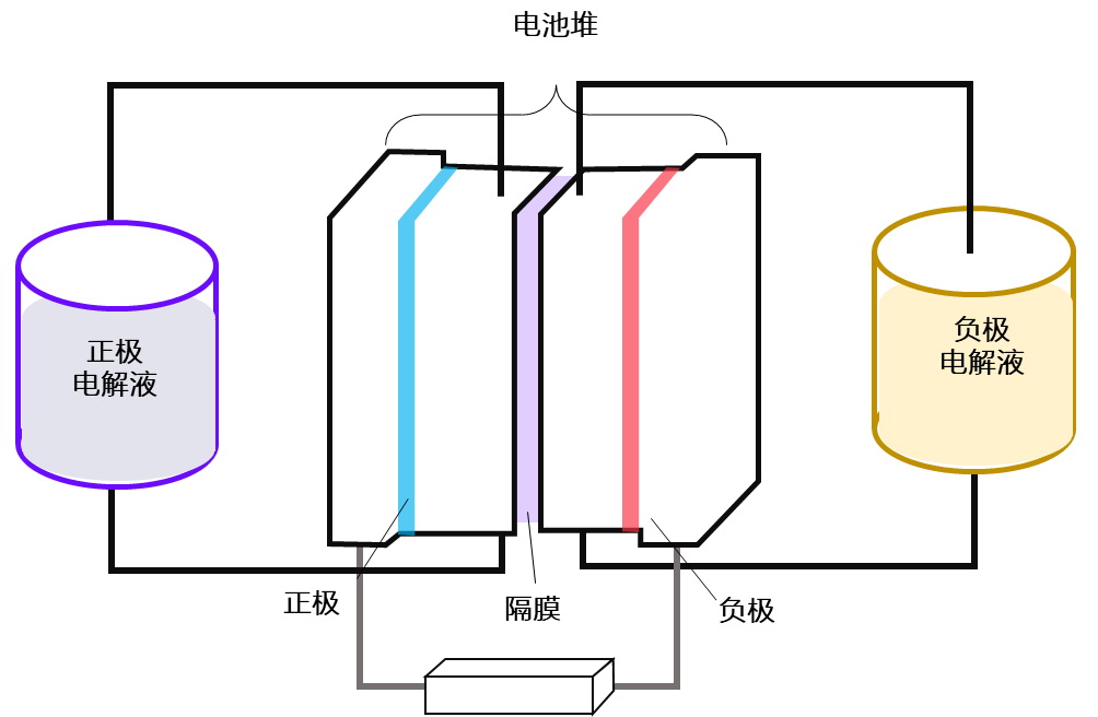 其次,從運(yùn)行原理上來看,液流電池的電解液,儲(chǔ)存在電池堆外的罐中。充放電時(shí),正負(fù)極電解質(zhì)會(huì)分別從循環(huán)泵進(jìn)入電池堆,發(fā)生氧化反應(yīng),反應(yīng)完成后,電解液會(huì)被重新泵回罐體中,照此循環(huán)往復(fù),直到反應(yīng)完全。由于電化學(xué)反應(yīng)和整個(gè)充放電過程,都是在水性的條件下發(fā)生,沒有燃燒爆炸的風(fēng)險(xiǎn),可確保絕對(duì)安全。