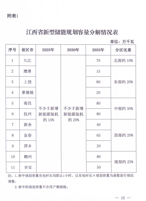 《發(fā)展規(guī)劃》制定了江西省分階段的儲(chǔ)能發(fā)展目標(biāo):到2025年、2030年,力爭(zhēng)實(shí)現(xiàn)各設(shè)區(qū)市新型儲(chǔ)能投產(chǎn)規(guī)模不少于新增新能源裝機(jī)的15%和20%。到2035年,力爭(zhēng)實(shí)現(xiàn)全省新型儲(chǔ)能投產(chǎn)600萬千瓦以上。