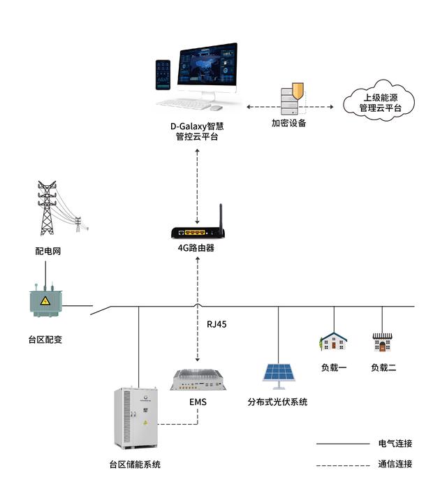 臺區(qū)的儲能系統(tǒng)不是獨立運行的,建立臺區(qū)間互聯(lián)互通的智能運維體系,結(jié)合臺區(qū)負(fù)荷特性進(jìn)行智能化的管理和調(diào)度,才能充分發(fā)揮其在電能治理方面的重要作用。弘正數(shù)字化儲能系統(tǒng)可以實現(xiàn)多個臺區(qū)間互聯(lián)互供,緩解負(fù)荷尖峰,均衡負(fù)載,提高剩余容量的利用率;同時,通過接入D-Galaxy智慧儲能管控平臺加速臺區(qū)間信息交互及優(yōu)化調(diào)控,實時監(jiān)測電網(wǎng)狀態(tài)和需求,快速響應(yīng)電網(wǎng)變化,完成控制系統(tǒng)能量管理策略和運行模式判斷與切換,增加電力系統(tǒng)靈活性,助力新型電網(wǎng)安全運行。