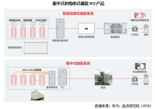 儲能PCS產(chǎn)品可以分為集中式、組串式、微型逆變器、儲能變流器及一體機等類型。根據(jù)儲能PCS的應用場景可以分為組串式和集中式兩大類,其中組串式主要應用于中小型儲能系統(tǒng),集中式應用于大型儲能系統(tǒng),產(chǎn)品形態(tài)適應源/網(wǎng)/荷側(cè)多種場景。不同應用場景對于儲能PCS的功能以及性能參數(shù)等的需求差異較大,因此針對不同的場景需要應用不同技術(shù)類型的儲能PCS。