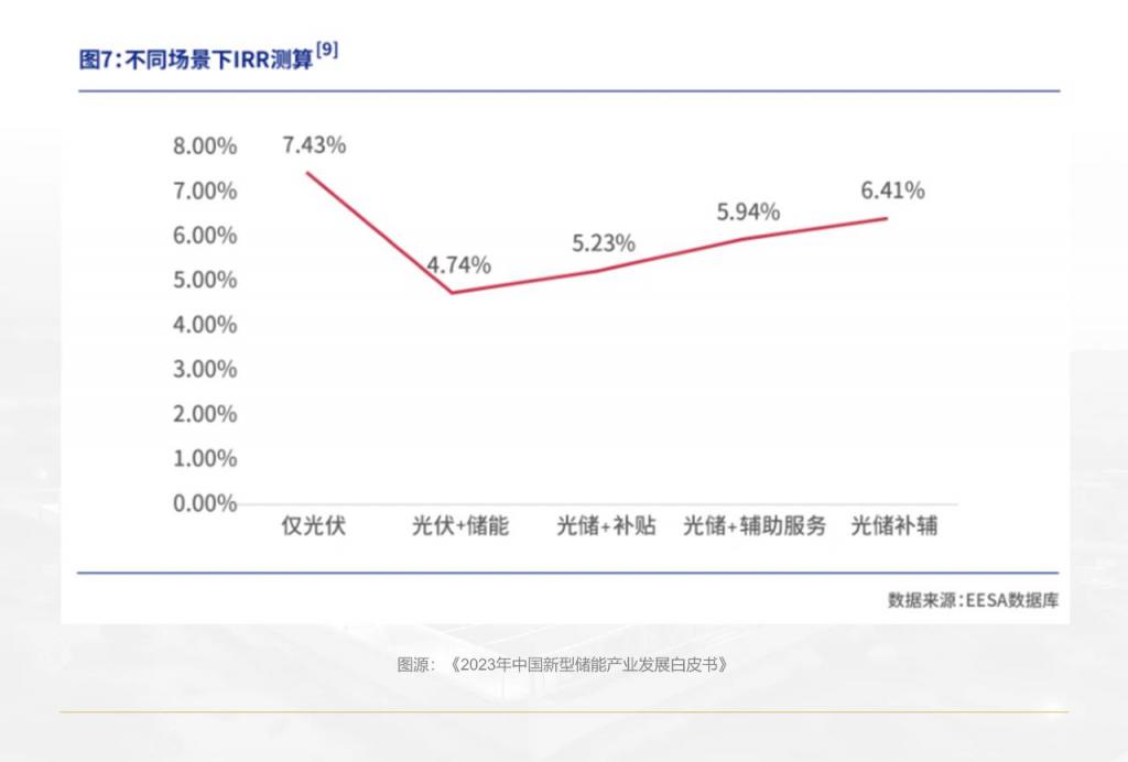 《2023 中國(guó)新型儲(chǔ)能行業(yè)發(fā)展白皮書》測(cè)算顯示:以內(nèi)蒙古某 100MW 光伏發(fā)電項(xiàng)目、配套 20MW/40MWh 儲(chǔ)能電站為例,其內(nèi)部收益率(IRR)在僅光伏發(fā)電的情景下,高達(dá) 7.43%;而配上儲(chǔ)能后,即便獲得政府補(bǔ)貼同時(shí)參與輔助服務(wù),IRR 也僅 6.41%。